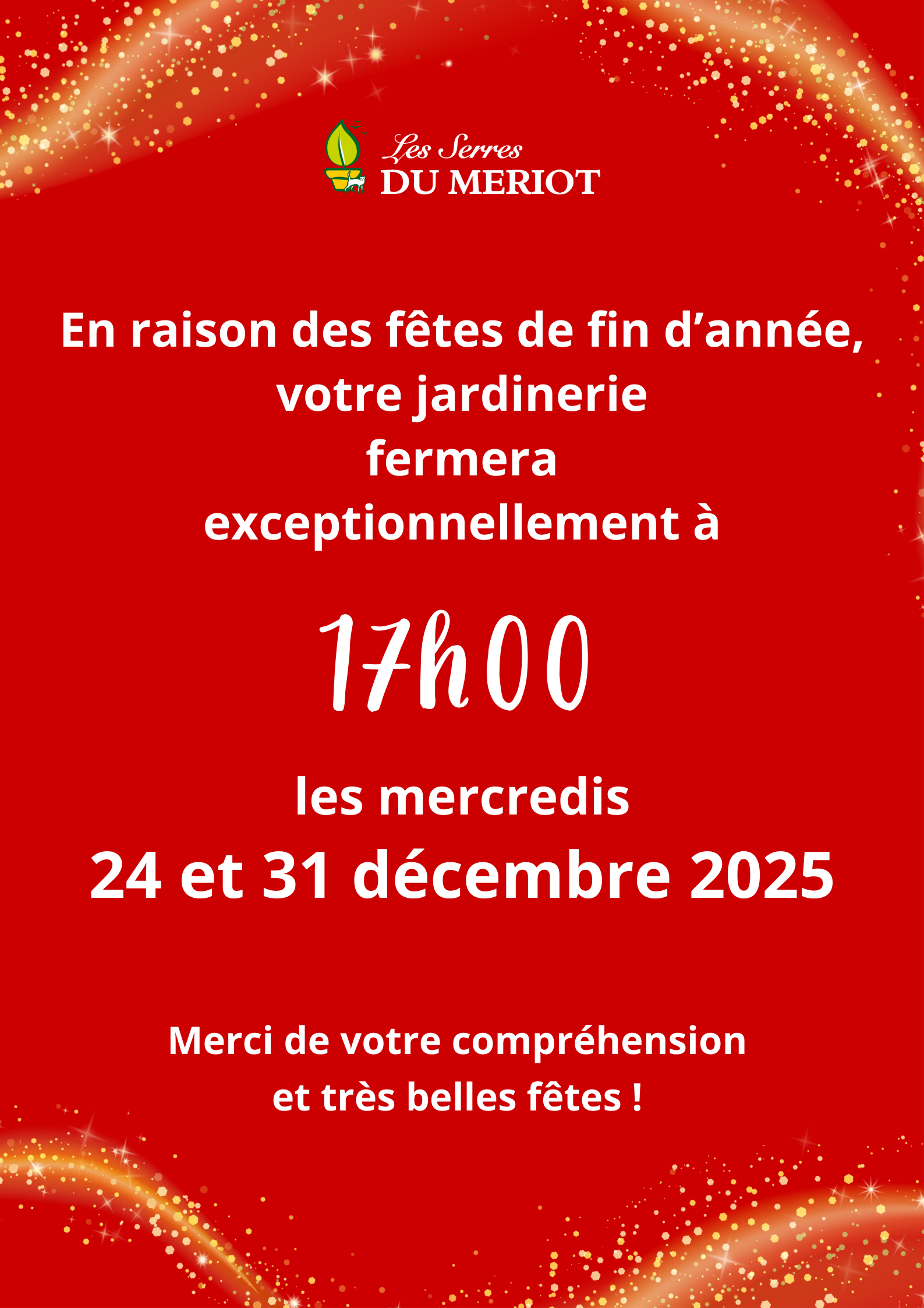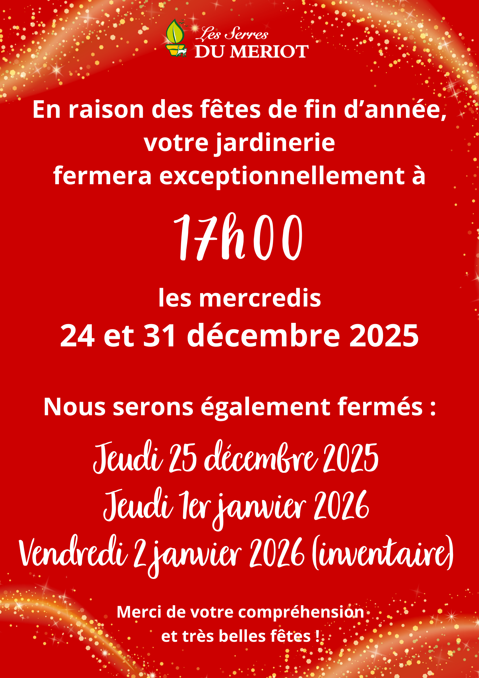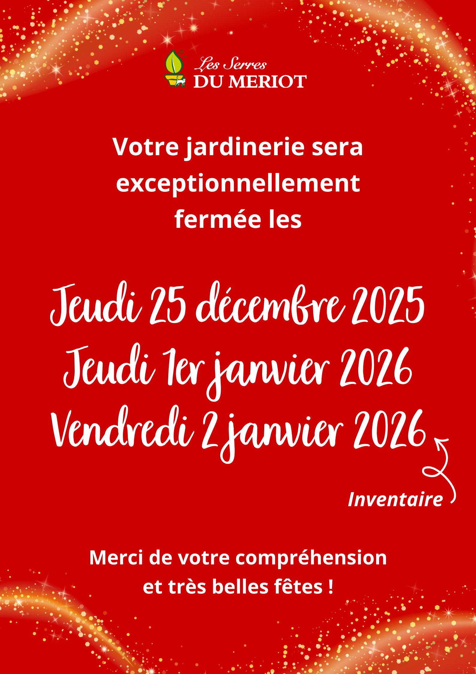 Nous serons fermés le 25 décembre 2025 ainsi que les 1er et 2 janvier 2026.